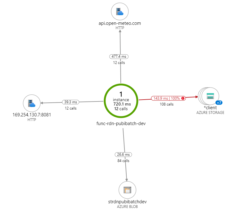 Because of the graph, I found two 404 errors for the Blob storage in the demo application. I was puzzled since there is no explicit code to access the Blob storage instead just the Azure Functions Blob binding. After further research, the Blob binding is first to check if the blob exists before creating it. Since the demo application logic is to create a new blob on every run, it will always get this error. Unfortunately, there is no switch to disable the check, you need to implement your own code instead of using Blob binding if you find this 404-error annoying. FYI, I properly would.