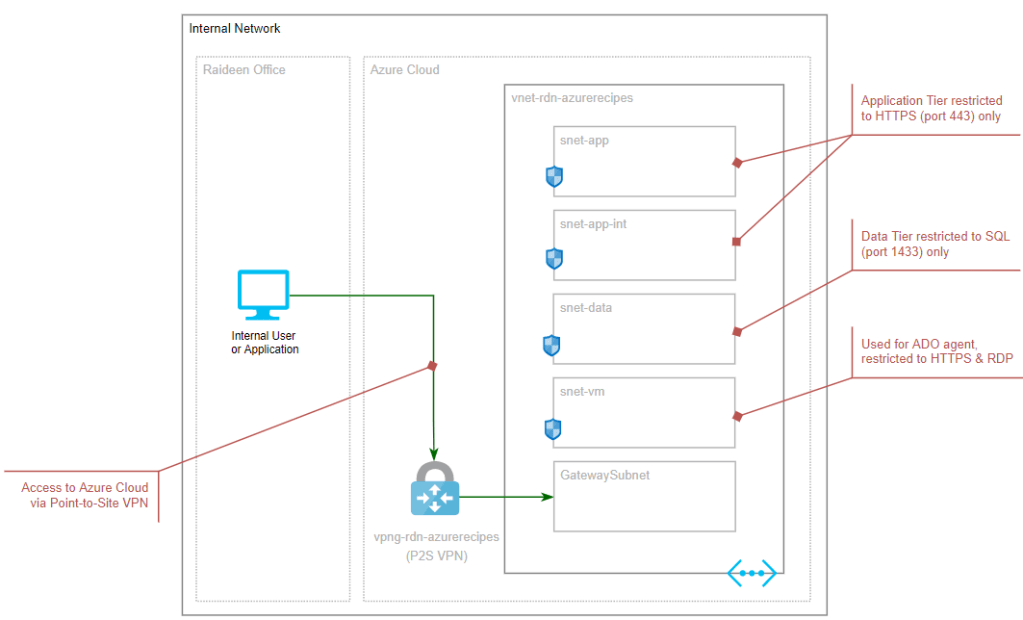 Basically, the topology has a single Virtual Network with multiple subnets, each subnet acts like a tier and is protected by Network Security Group. To connect from my office or home computer, I utilize Virtual Network Gateway with Point-to-Site (MS Doc link). I am placing the Azure DevOps (ADO) self-hosted agent in the Virtual Machine subnet just for simplicity, you should consider having a ‘management’ virtual network for the ADO self-hosted agent since it should be shared across your organization and access to different virtual networks.